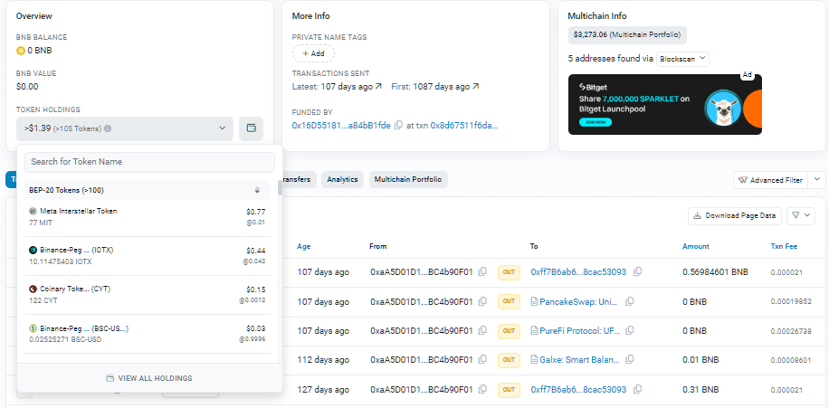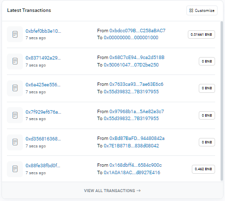 - Tokens: Información sobre tokens BEP-20 y BEP-721, incluyendo lista de tokens y transferencias.