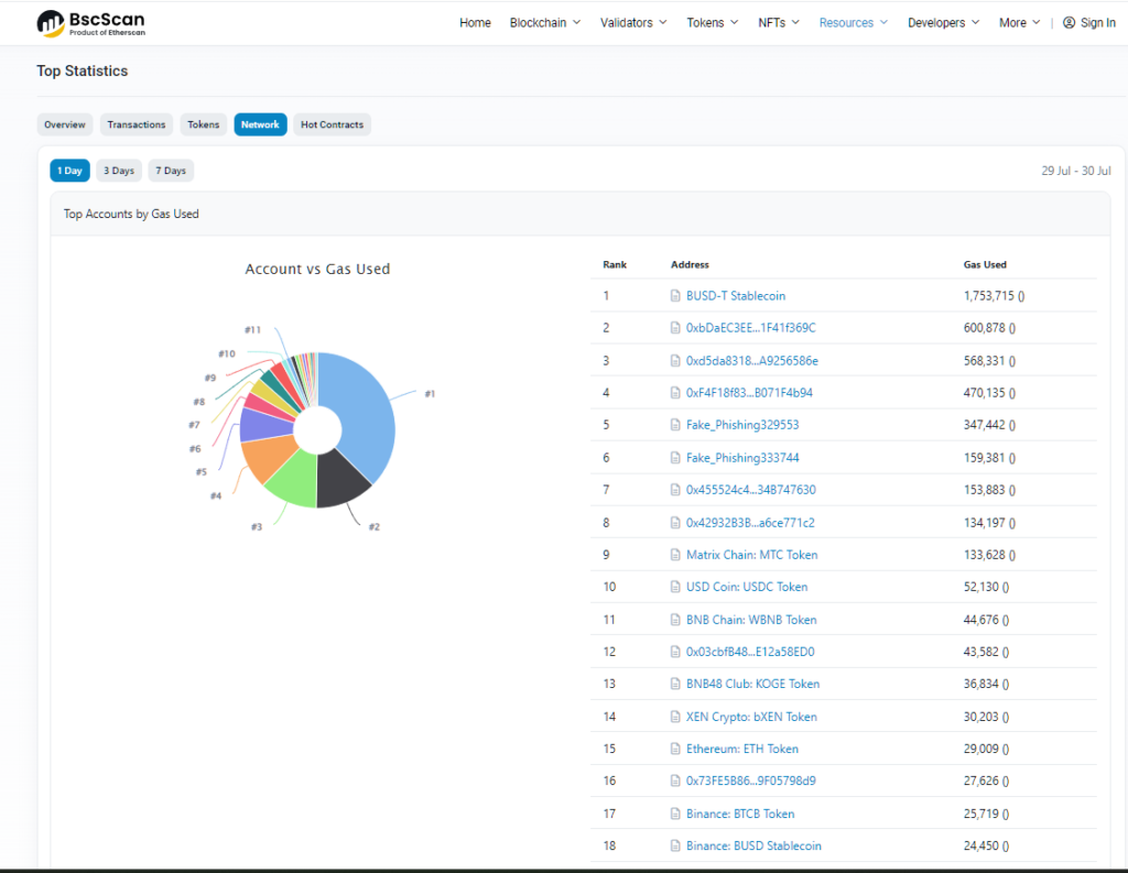 - Análisis y Estadísticas: Proporciona herramientas analíticas avanzadas que incluyen gráficos de historial de transacciones, tarifas de gas, y actividad de la red para ayudar a los usuarios a entender mejor la dinámica de la BNB Chain.