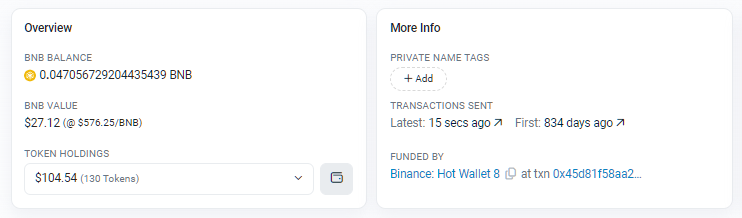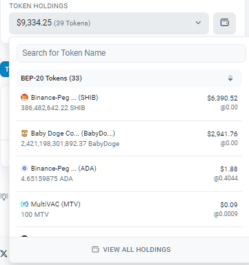 - Una lista de tokens que la billetera posee, clasificados por tipo (BEP-20 para tokens fungibles, BEP-721 para tokens no fungibles o NFTs).