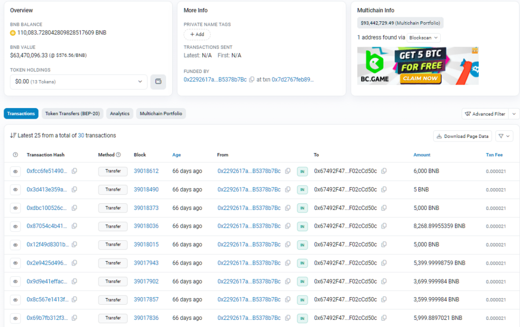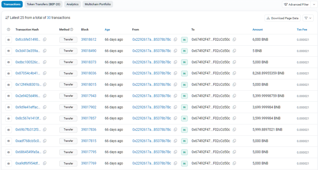 - Las transferencias recientes de tokens, con detalles similares a las transacciones de BNB.